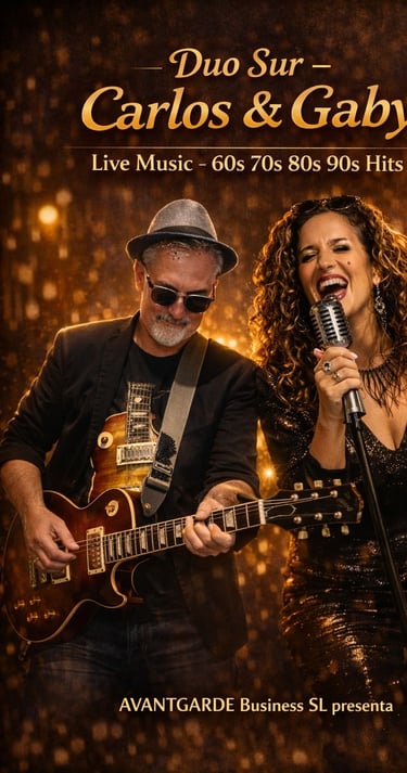 Duosur está formado por Carlos (guitarra y voz) y Gabriela (voz), una pareja de toda la vida y dos grandes músicos con una conexión muy especial en el escenario. Su repertorio combina jazz, pop y swing con los grandes éxitos bailables de los años 70, 80 y 90, creando un ambiente elegante, cercano y festivo para todo tipo de público.