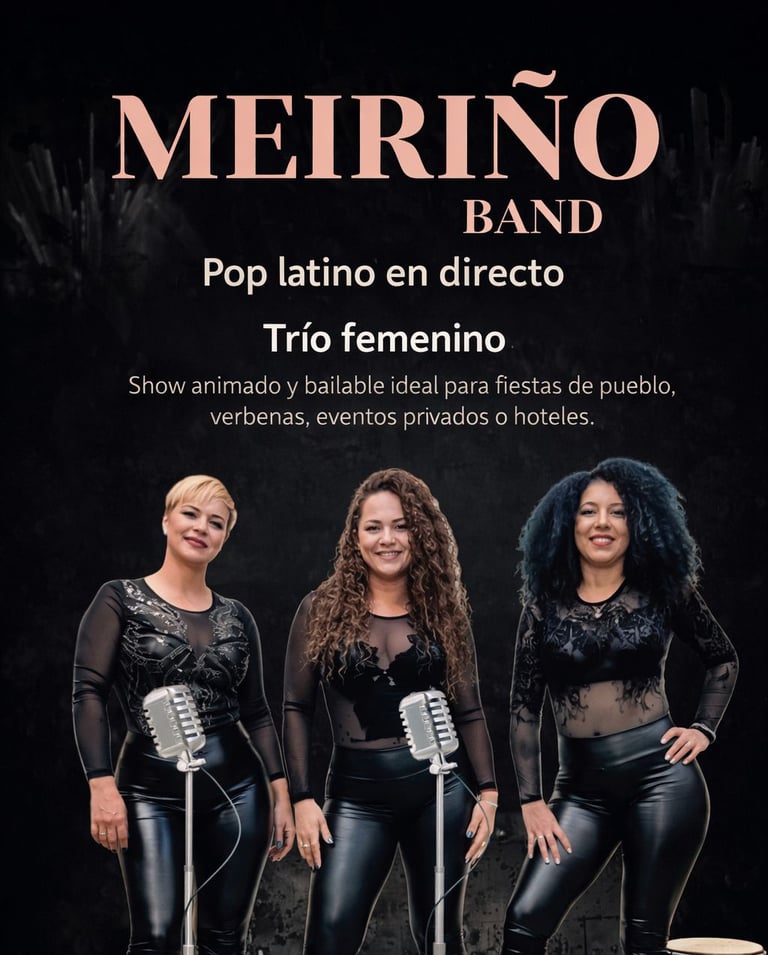 Trío femenino de pop latino con un show alegre y bailable, perfecto para fiestas de pueblo, verbenas, eventos privados y grandes galas en Canarias y España.