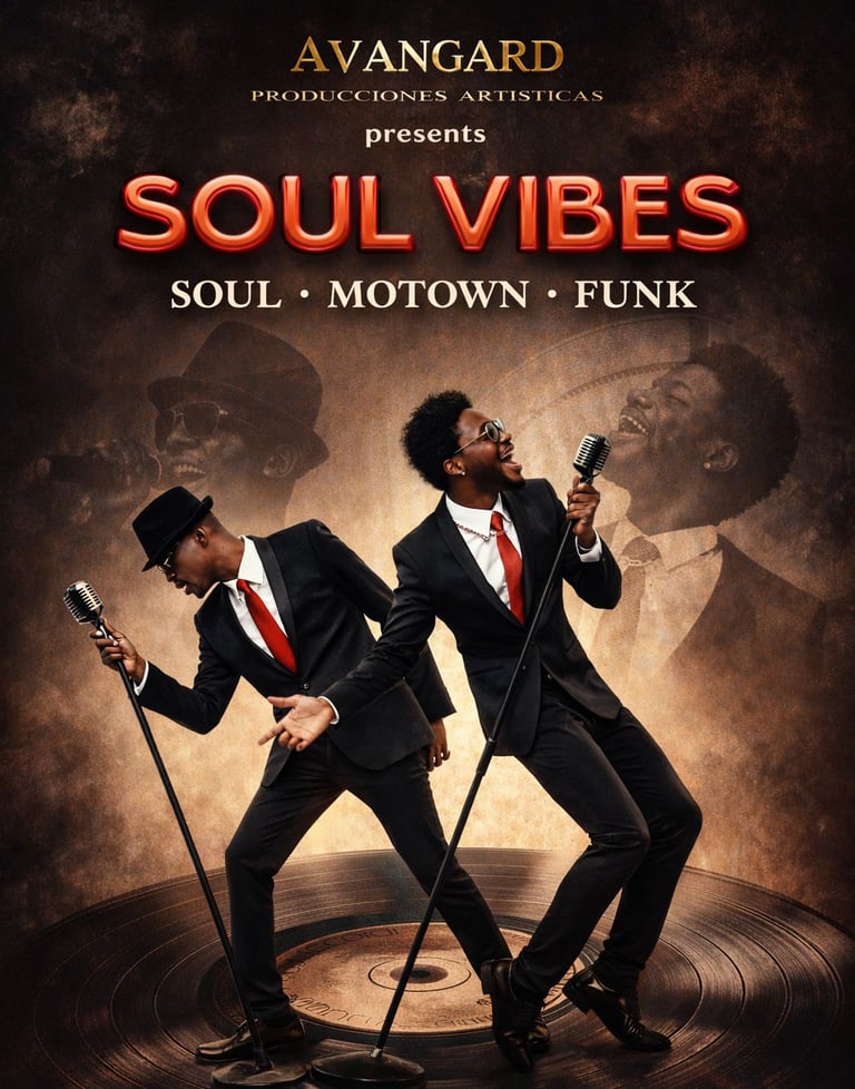 Dúo vocal con un potente show musical inspirado en la mejor época del soul y la Motown: clásicos de Marvin Gaye, Stevie Wonder, The Temptations y muchos más, con toques de funk y R&B moderno.