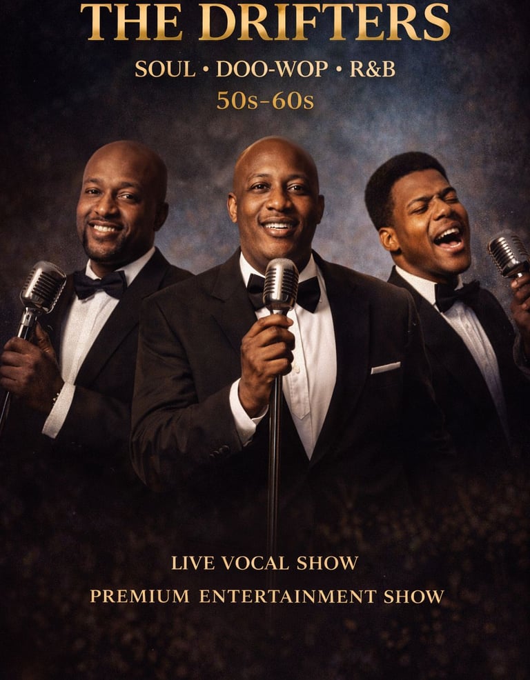 Un repaso en directo por los grandes éxitos de The Drifters y el mejor sonido soul & doo-wop americano, con armonías vocales cuidadas y mucho ritmo.
